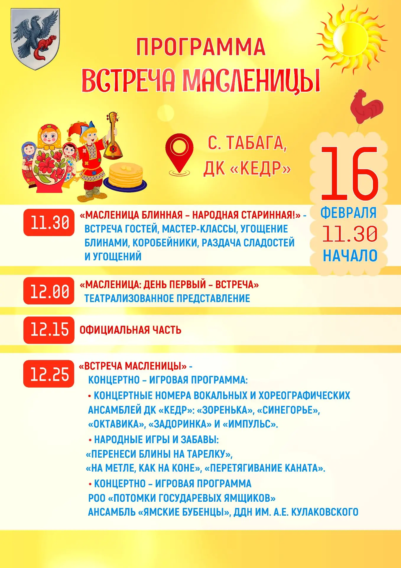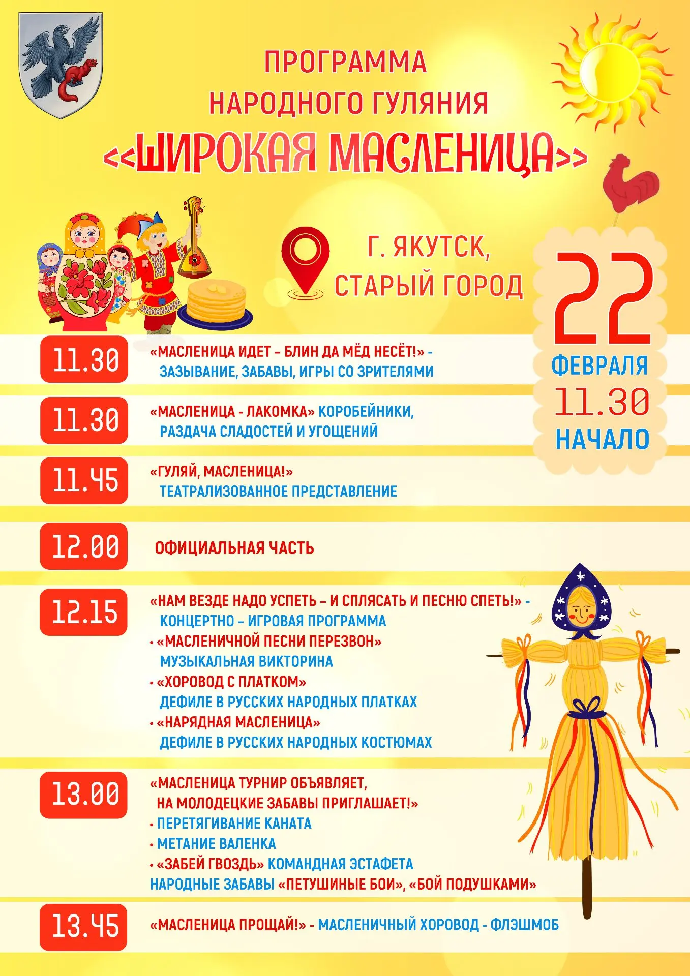 Администрация города Якутска объявила о старте Масленичной недели, которая пройдет с 16 по 22 февраля. Жителей и гостей столицы ждет насыщенная программа мероприятий: народные гуляния, концерты, спортивные состязания и, ароматные блины.
