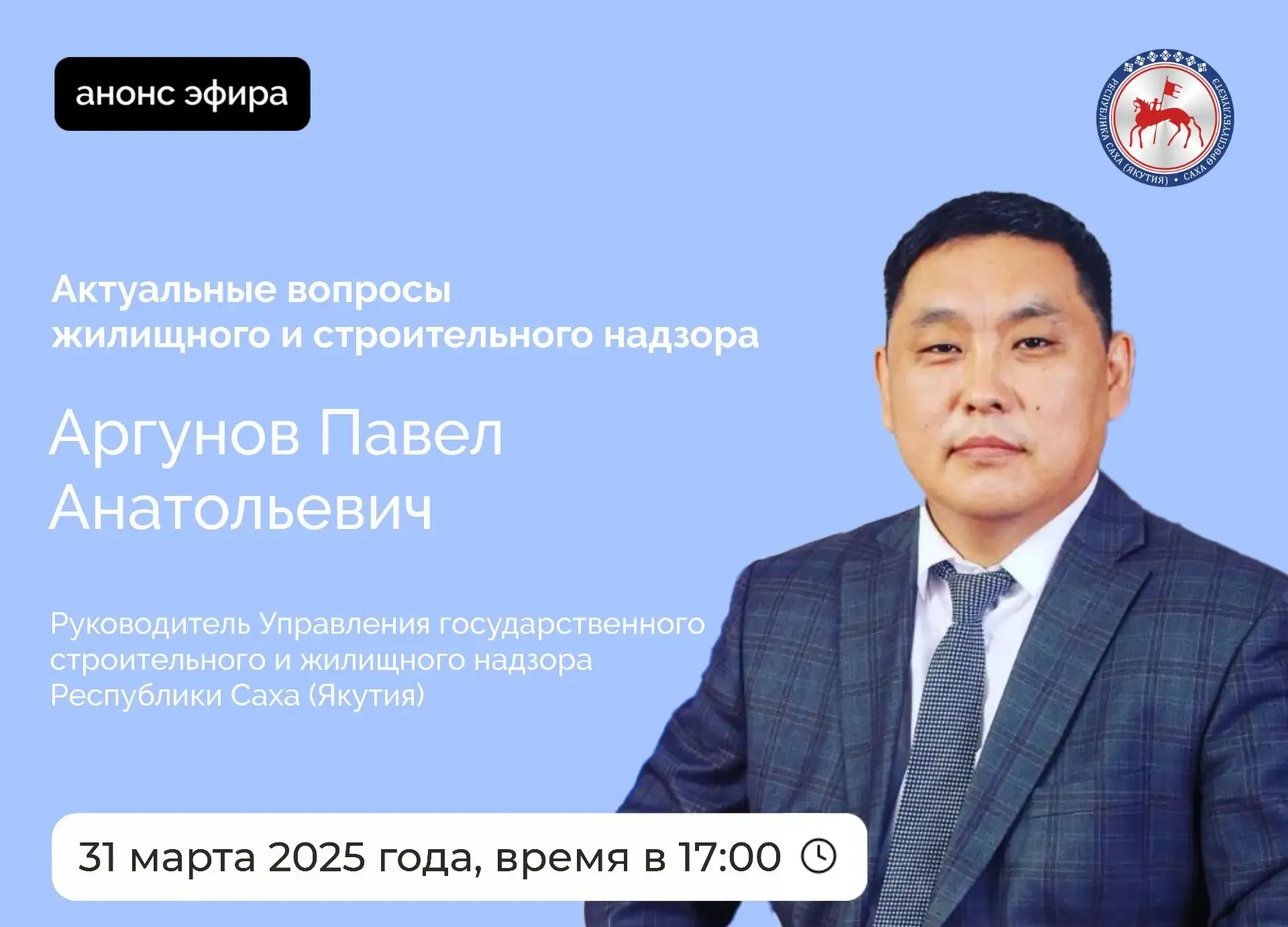 Руководитель управления государственного строительного и жилищного надзора Якутии Павел Аргунов проведет прямой эфир в социальных сетях во вторник, 31 марта.