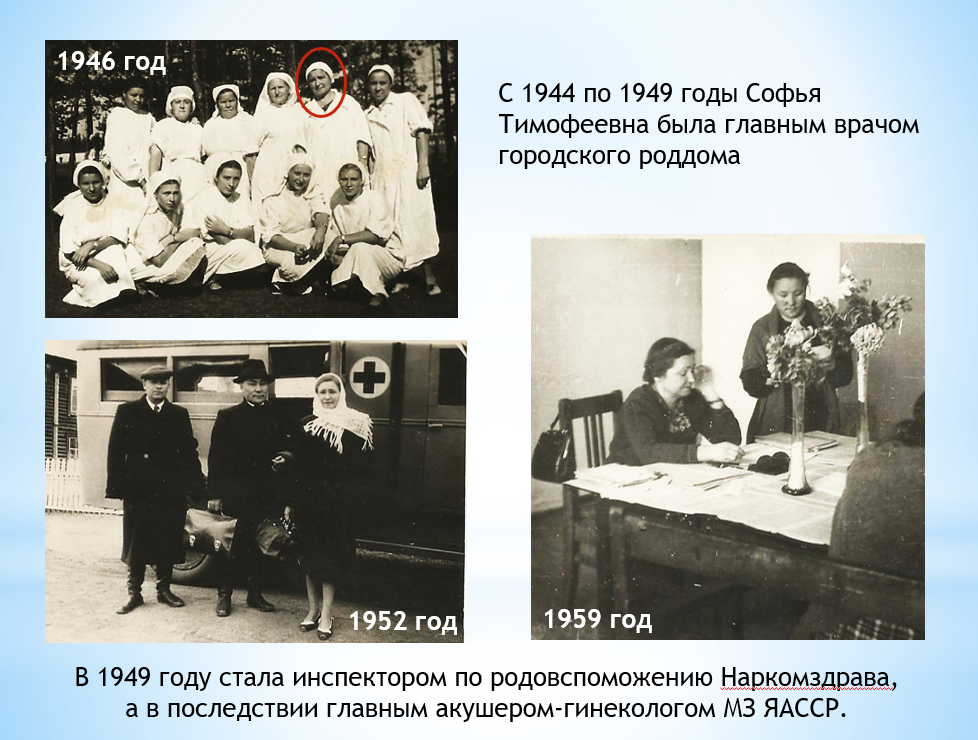 Ее стиль работы не изменится и тогда, когда в 1939-м они передут в Якутск – Софью Тимофеевну назначат главным врачом городского роддома. А когда в структуре Минздрава ЯАССР впервые была учреждена должность главного акушера-гинеколога республики, начинать новое дело доверят именно ей. В 1949 году она станет первым главным акушером-гинекологом Минздрава Якутии, немало сделав для развития этой службы: внедрения новых методов лечения, подготовки кадров, а главное, снижения материнской и младенческой смертности в республике.