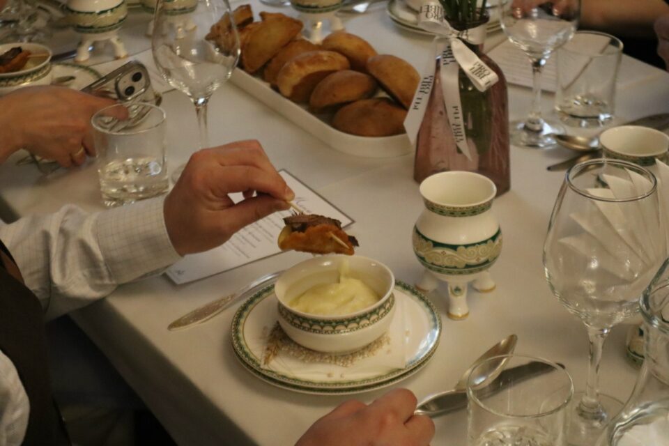 Первый туристический сет вобрал в себя вкусовое наследие народов Якутии в современной авторской подаче Николая Атласова. Гастрономический вечер открыл якутский саламат, поданный со шпажкой с оладушкой и жеребятиной. Вторым блюдом подали эвенкийскую строганину с сугудаем по-долгански из трех видов рыб. Третьим курсом стала уха по-чукотски с сушеной рыбой юколой по рецептам древних охотников. Суп официанты залили на стейк с овощами и микрозеленью и подали тугунка с якутской лепешкой. Горячим блюдом была обожженная русская картошка с амгинским сыром, олениной и чипсами из ягеля. Эвенский десерт представил из себя сгущенку, перемешанную с брусникой и кедровыми орехами, внутри скорлупы из шоколада и ореха.