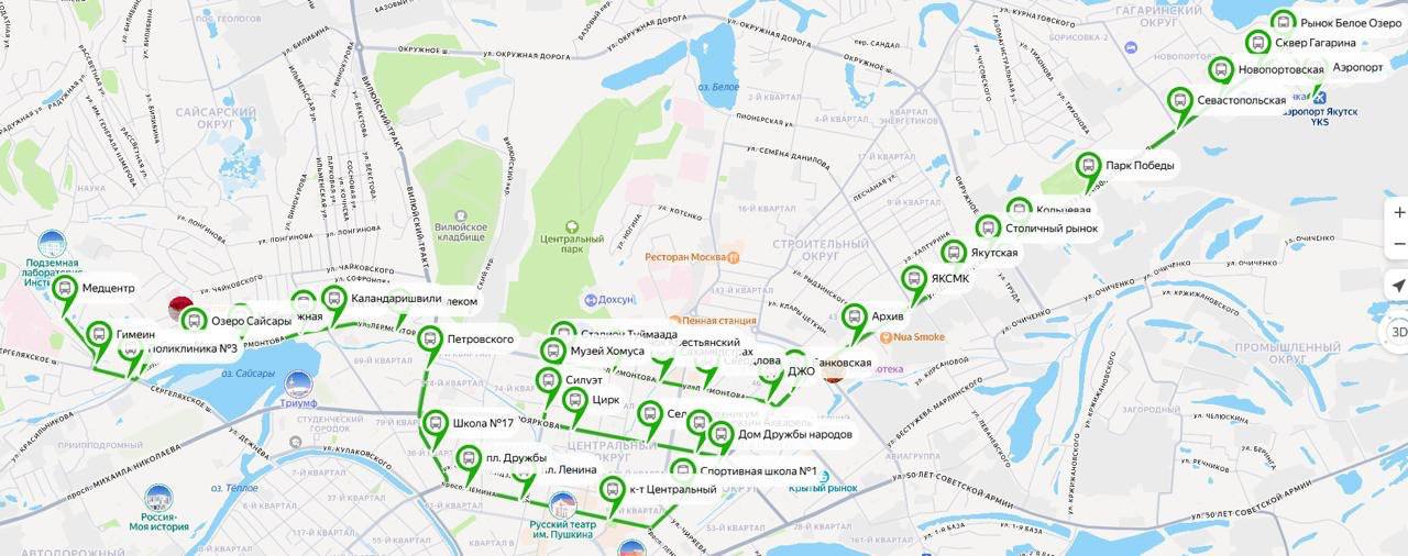 Маршрут охватит основные улицы центральной части города и пригородные районы. Движение начнётся от конечной остановки «Медцентр». Далее автобусы проследуют по Сергеляхскому шоссе, улицам Лермонтова, Петровского, проспекту Ленина, улице Дзержинского, Пояркова, Кирова, снова по улице Лермонтова, затем по улице Дзержинского, автостраде 50 лет Октября, улицам Можайского, Гагарина, Быковского и завершат маршрут на остановке «Аэропорт».