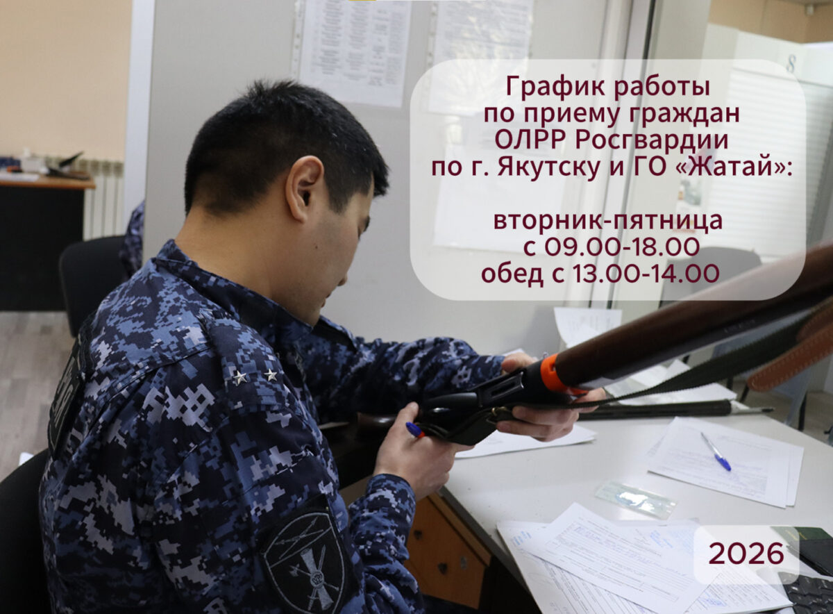 В 2026 году график приема граждан в отделе лицензионно-разрешительной работы по Якутску и Жатаю Управления Росгвардии по вопросам предоставления государственных услуг в сферах оборота оружия, частной детективной и охранной деятельности осуществляется со вторника по пятницу с 09:00 до 18:00 с перерывом на обед с 13 до 14 часов.