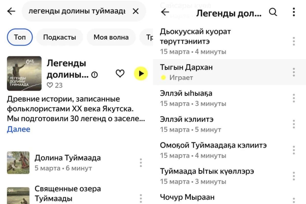В приложении «Яндекс Музыка» теперь доступен раздел с аудиоподкастами на якутском языке. Проект получил название «Легенды долины Туймаада». Об этом сообщил мэр Якутска Евгений Григорьев.