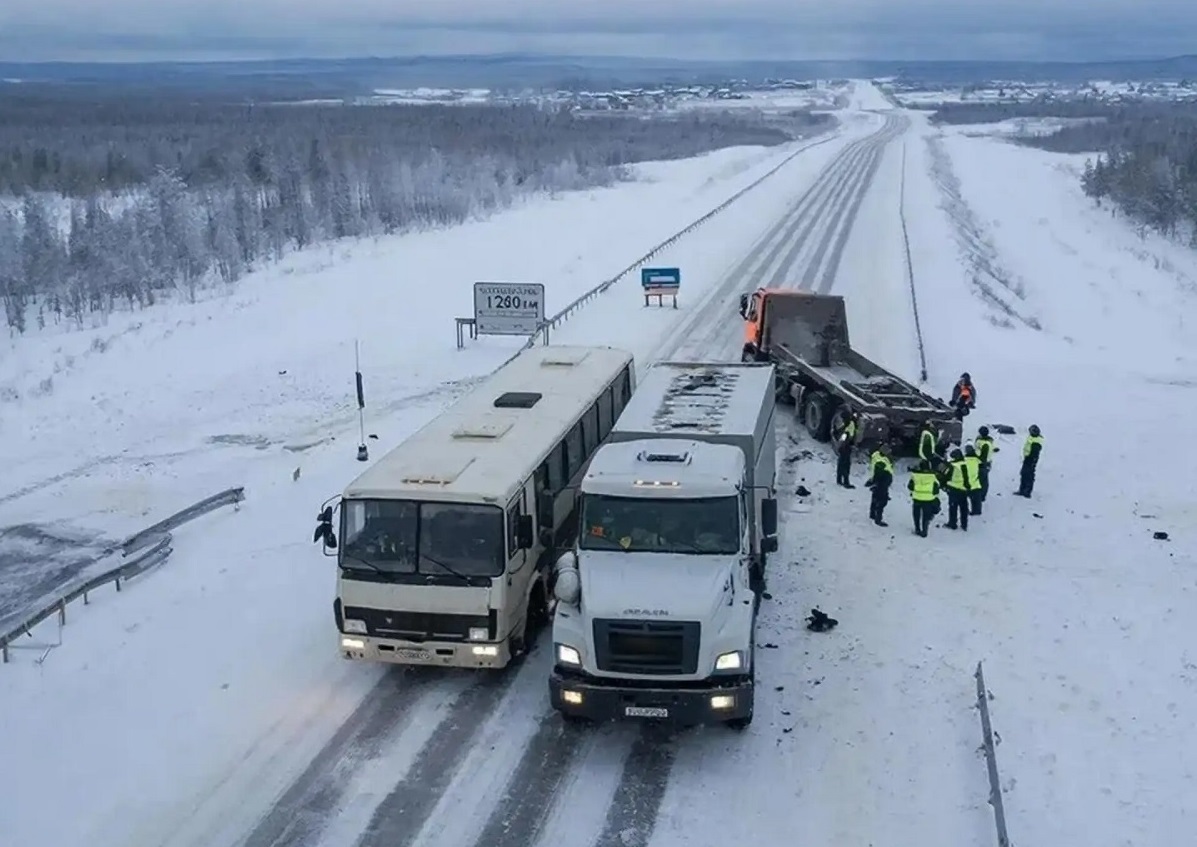 Вахтовый автобус и грузовик столкнулись в 32 км от села Тас-Юрях Мирнинского района. Ближайший водоем — река Амбардах — находится в 6 километрах от места ДТП, поэтому ситуация требует особого контроля экологической обстановки, отметили в министерстве.