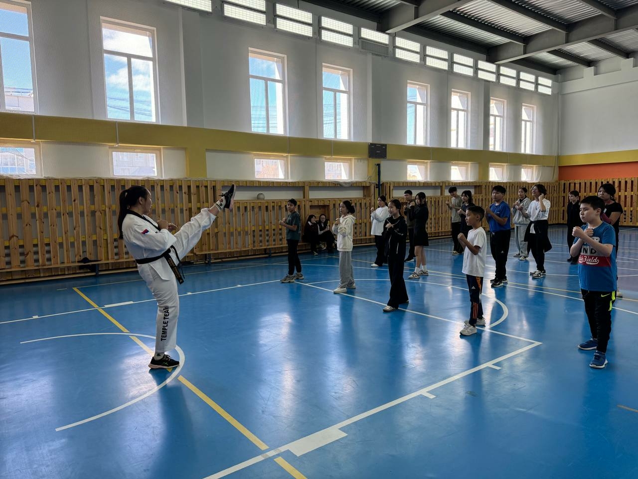 Урок физической культуры для учащихся школы № 31 провела Варвара Афанасьева, выпускница игр по тхэквондо, основатель школы единоборств «Темпл».
