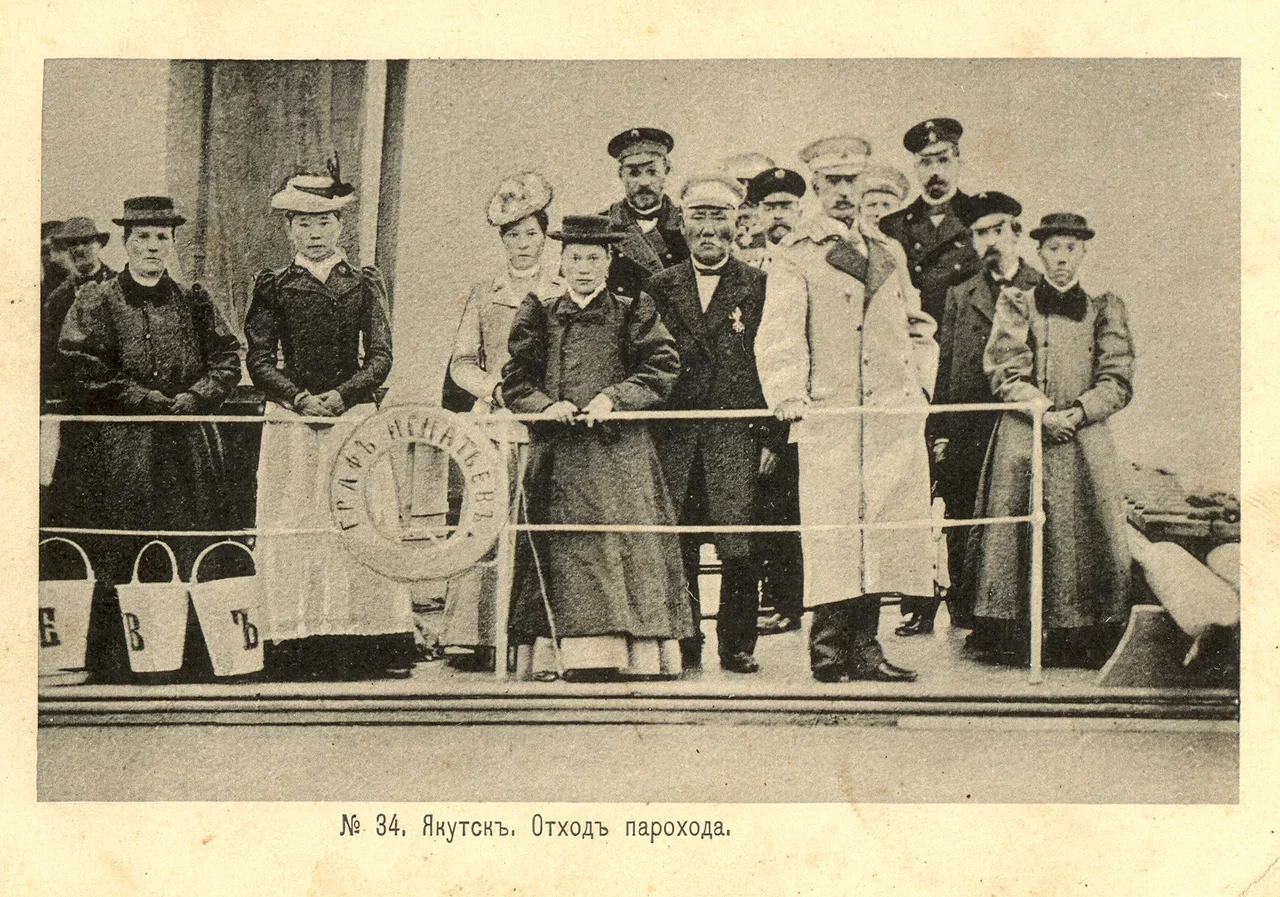 Большая удача, что фотограф попросил людей на фотографии встать таким образом, что в кадр попал спасательный круг – это сразу дает нам название парохода, что отходит от города Якутска: «Граф Игнатьев».