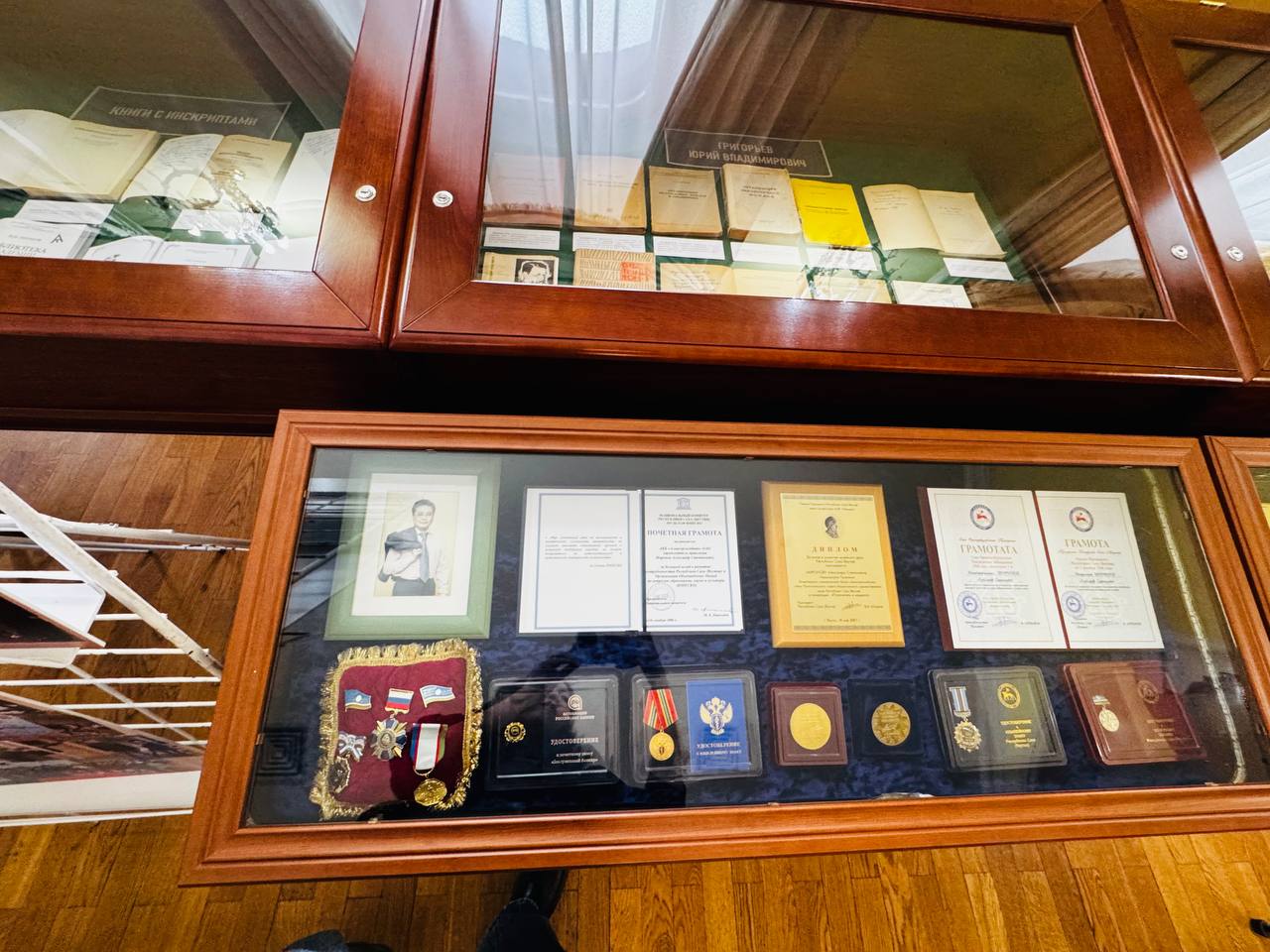 На выставке представлены статьи, книги, журналы, фотографии из семейного архива и государственные награды Миронова.